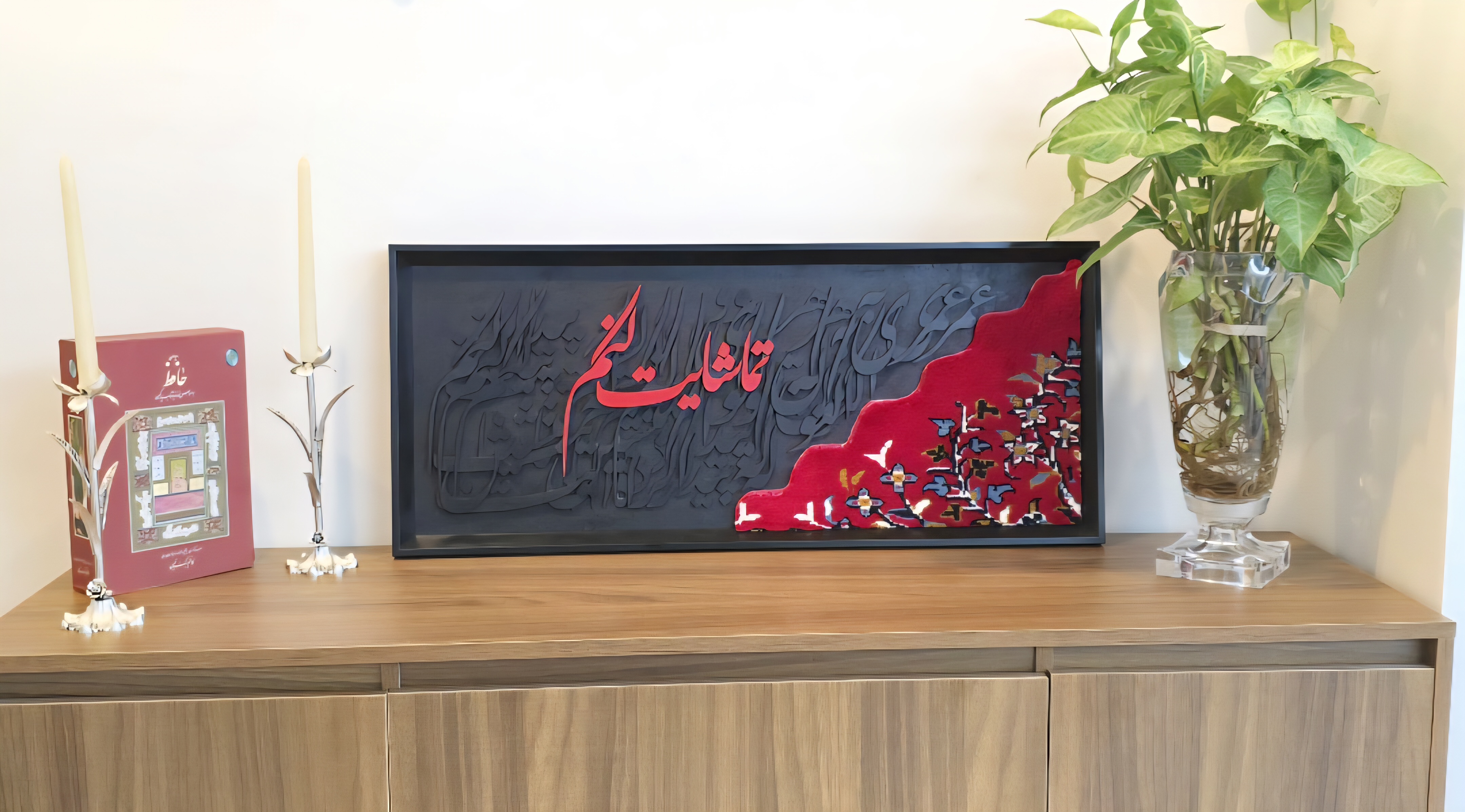 متن شعر تابلو «عمری به هر کوی و گذر گشتم که پیدایت کنم اکنون که پیدا کرده ام بنشین تماشایت کنم» می باشد.