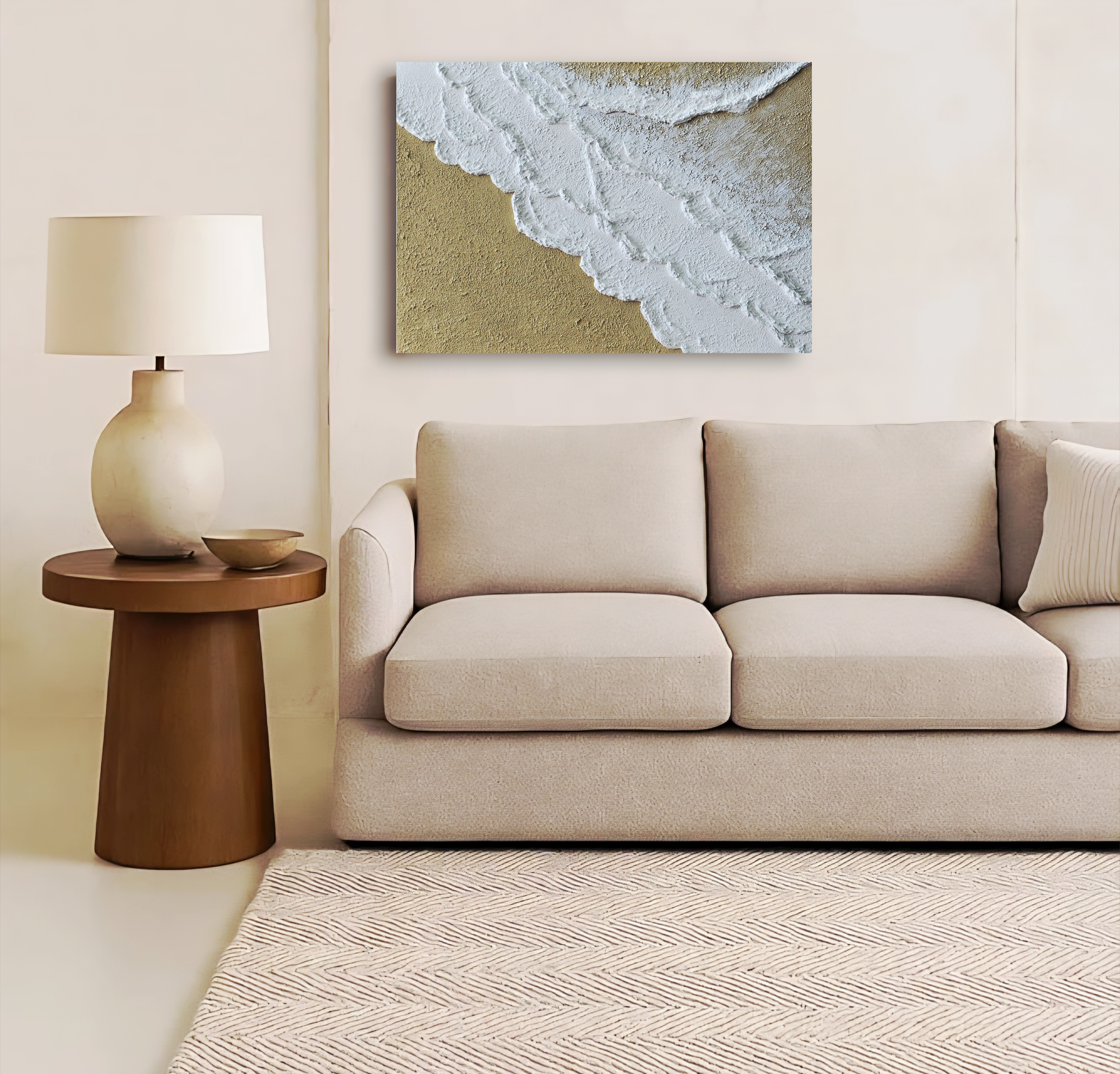 تابلو مدرن مینیمال تکسچر دریا، با ابعاد ۵۰×۷۰ در گالری روشن موجود است. متریال مورد استفاده در این تابلو، تکسچر، رنگ اکریلیک و بوم با کیفیت است. رنگ تابلو در واقعیت به دلیل تاثیر نور در عکاسی، یک درجه با رنگ عکس تفاوت دارد.